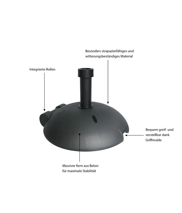 Doch Sie müssen nicht meinen, weil dieser Design Schirmständer eine gelungene Optik aufweist, wurde weniger Wert auf die Funktion gelegt. Eher das Gegenteil! Der Design Schirmständer verfügt über einen 40 kg schweren Betonkern, der ihn in die Lage versetzt, auch größere Sonnenschirme fest und sicher zu halten. Und da der Betonkern mit Kunststoff ummantelt wurde, ist der Design Schirmständer auch wunderbar strapazierfähig und absolut witterungsbeständig. Und mit den integrierten Rollen und der Griffmulde kann der Design Schirmständer auch ganz bequem bewegt werden, so dass Sie den Schatten immer dort haben können, wo Sie ihn gerade brauchen!