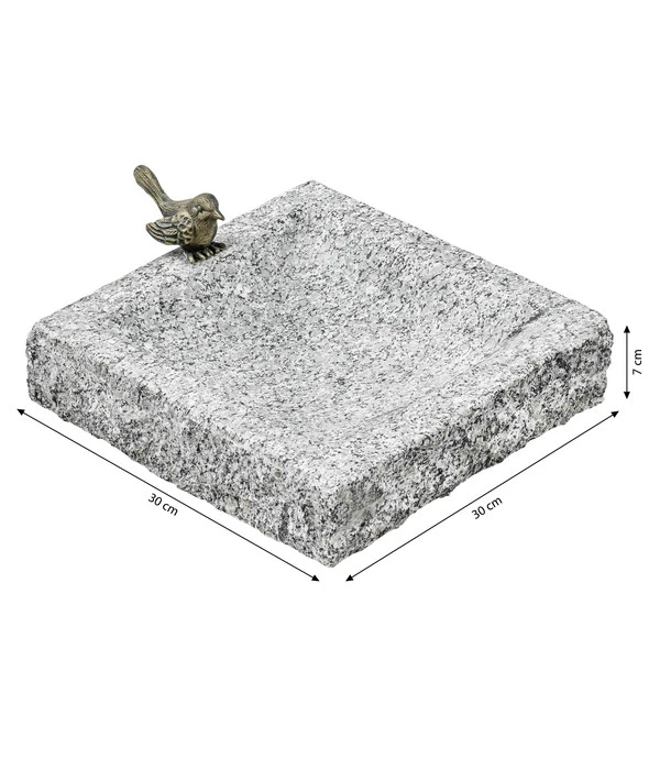 Auch die 30 x 30 cm große Wasserschale ist ein echter Hingucker in Beet oder Rasen. Denn sie besteht aus massivem Granit. Der edle Naturstein ist an seiner typischen Maserung zu erkennen. Dass der Künstler sich entschied, die Wassermulde sanft gerundet und mit glatter Oberfläche auszuarbeiten, im Kontrast dazu jedoch den äußeren Rand des Steinobjekts nur grob zu behauen, sorgt für angenehme Spannung. Die Dehner Granit-Vogeltränke integriert sich dadurch auch ganz natürlich die Gartenumgebung. Eine sehr hochwertige Tränke, mit der Sie sich nicht nur für ein funktionales Produkt, sondern auch für ein attraktives Gartendeko-Objekt entscheiden.